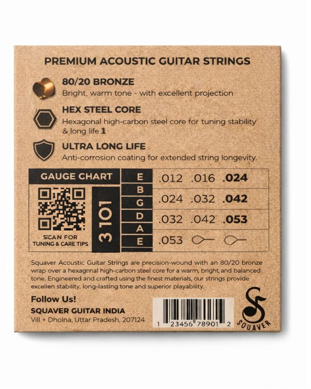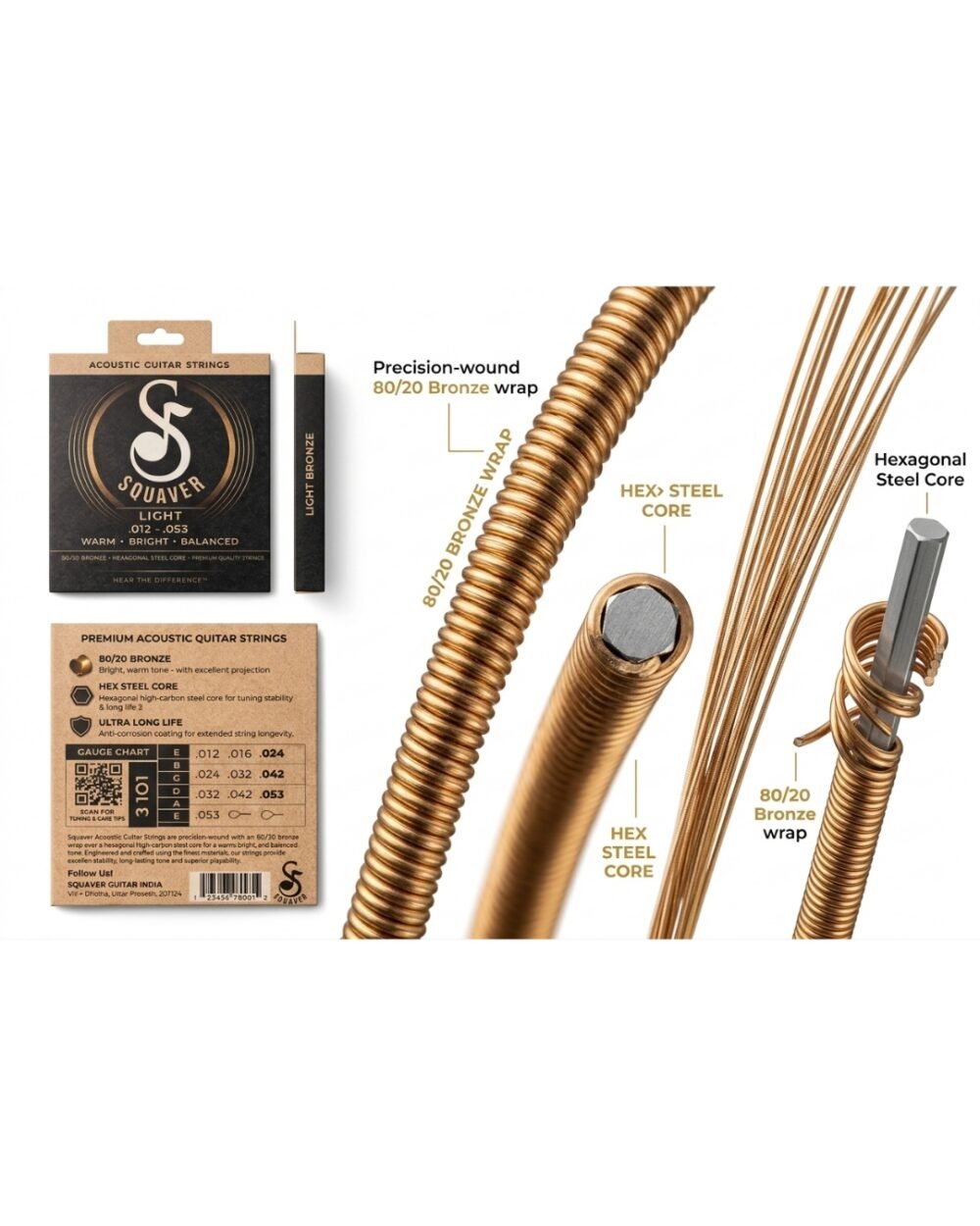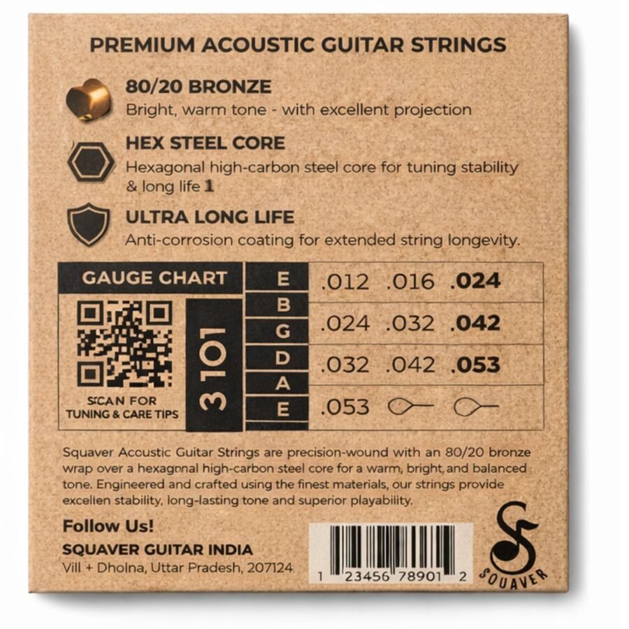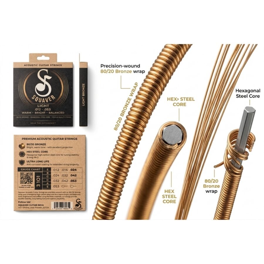 Upgrade your sound with Squaver Acoustic Guitar Strings, crafted for musicians who demand clarity, durability, and a premium playing experience. Designed with 80/20 bronze winding and a high-carbon hex steel core, these strings deliver a bright, warm, and perfectly balanced tone—ideal for both beginners and professionals.