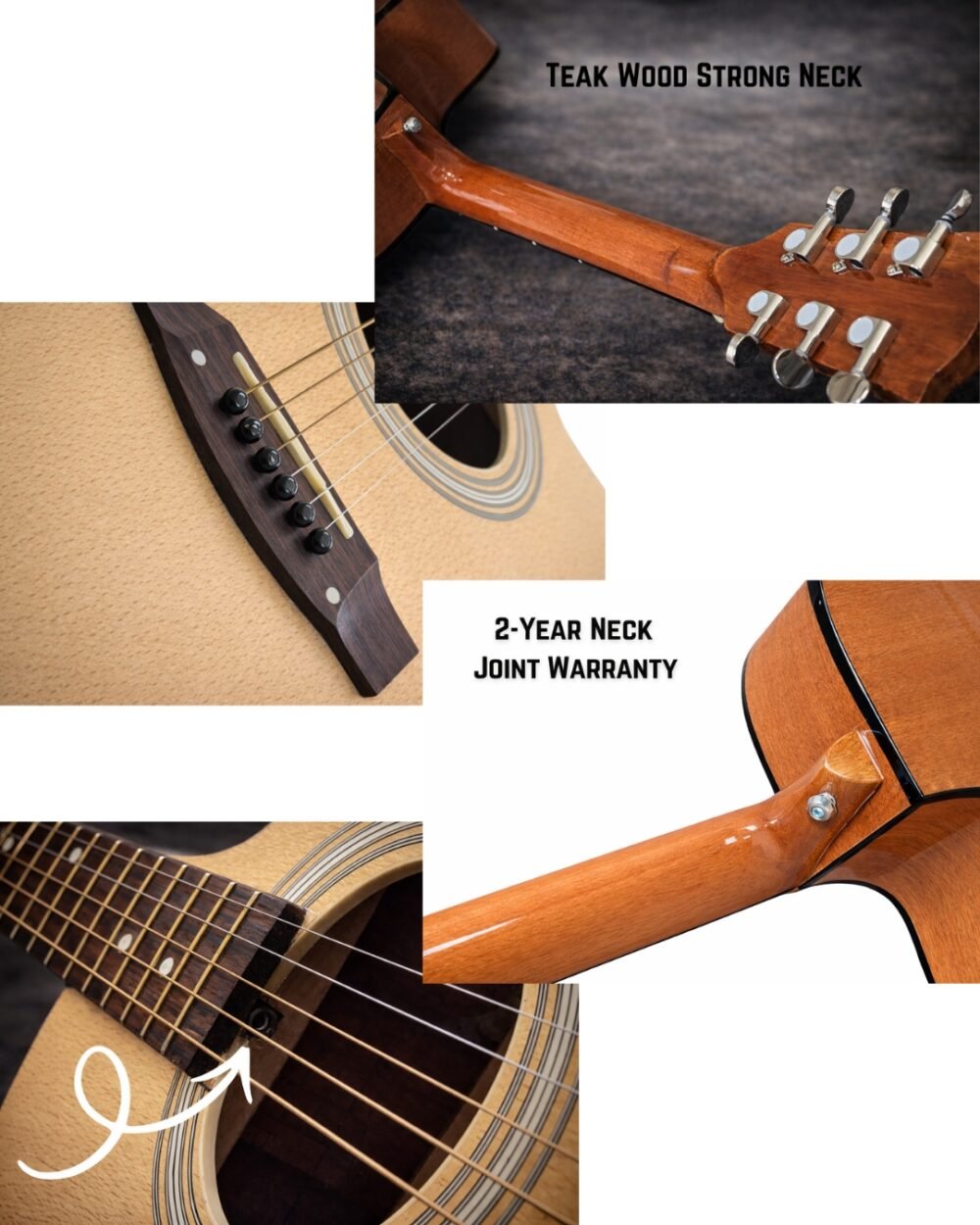 The SQUAVER 39″ Cutaway Acoustic Guitar in Natural Gloss finish combines classic aesthetics with dependable performance. Crafted from durable laminated wood, this guitar delivers a warm, balanced tone while maintaining structural strength for long-term use.
